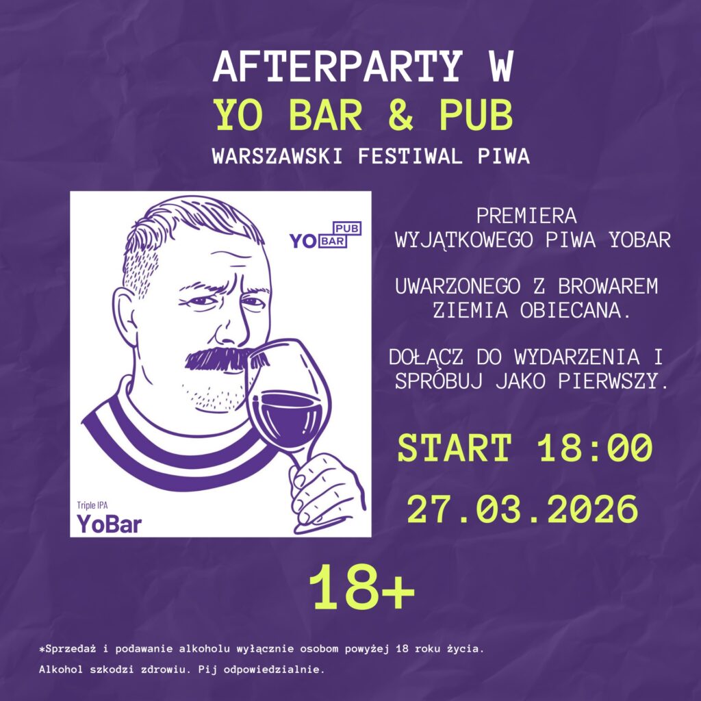 Po zakończeniu dnia festiwalowego zapraszamy na oficjalne afterparty Warszawskiego Festiwalu Piwa w YoBar & Pub. To miejsce, w którym w luźnej atmosferze można spotkać się z innymi uczestnikami festiwalu, porozmawiać o piwie oraz spędzić wieczór w gronie miłośników kraftu. Na gości czeka szeroki wybór piw kraftowych z kranu, jedzenie oraz barowa atmosfera sprzyjająca spotkaniom po festiwalu. Podczas wydarzenia dostępne będzie również wyjątkowe piwo uwarzone we współpracy z Browarem Ziemia Obiecana – YoBar przygotowane specjalnie na tę okazję.